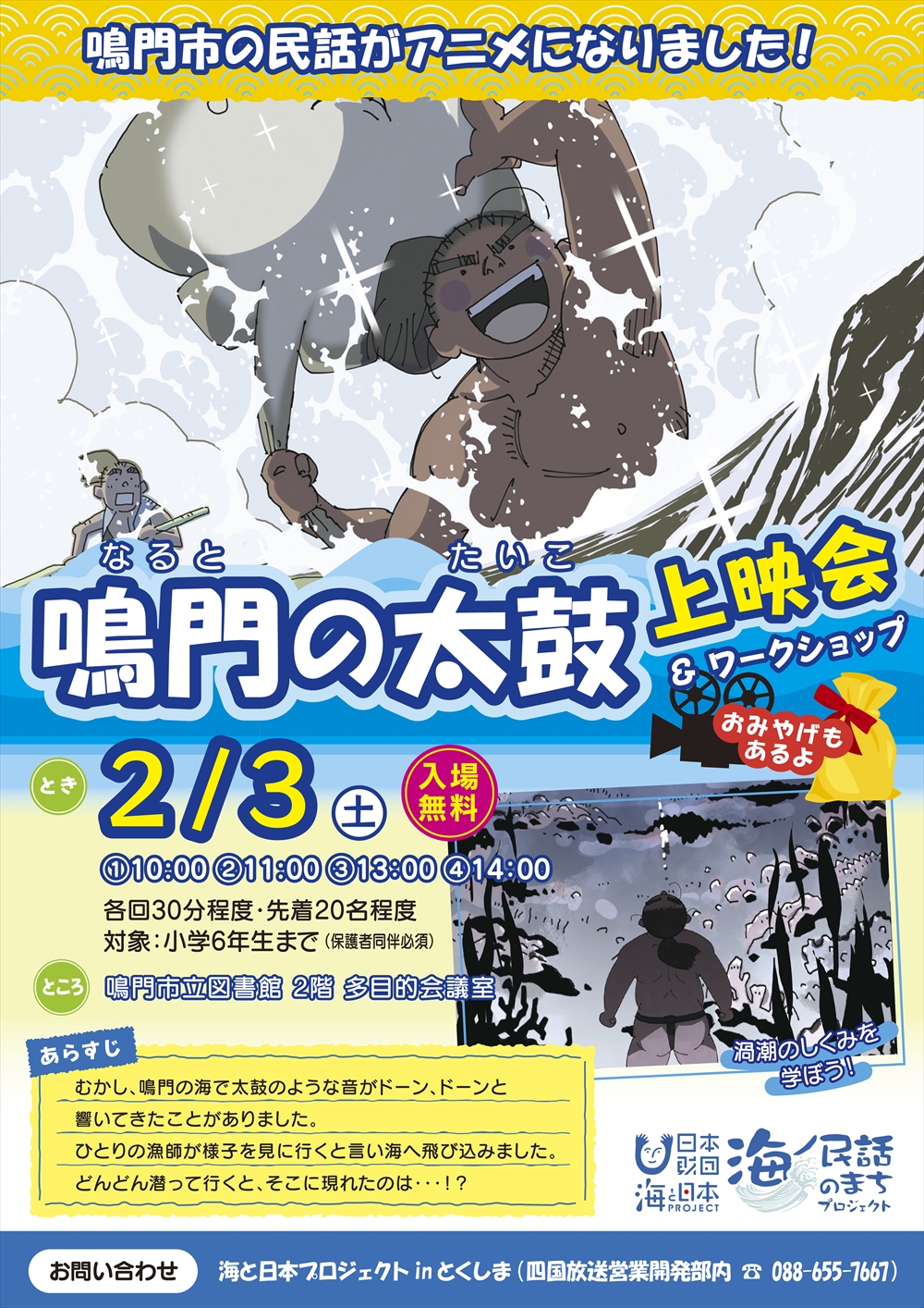 「鳴門の太鼓」アニメは、駅前案内所や観光情報センターでも常時上映されるほか、海ノ民話のまちプロジェクト公式YouTubeチャンネル(https://www.youtube.com/watch?v=nnL8SqIDo7U)でも公開されていますので、上映会に来られない方はチェックしてみてください。