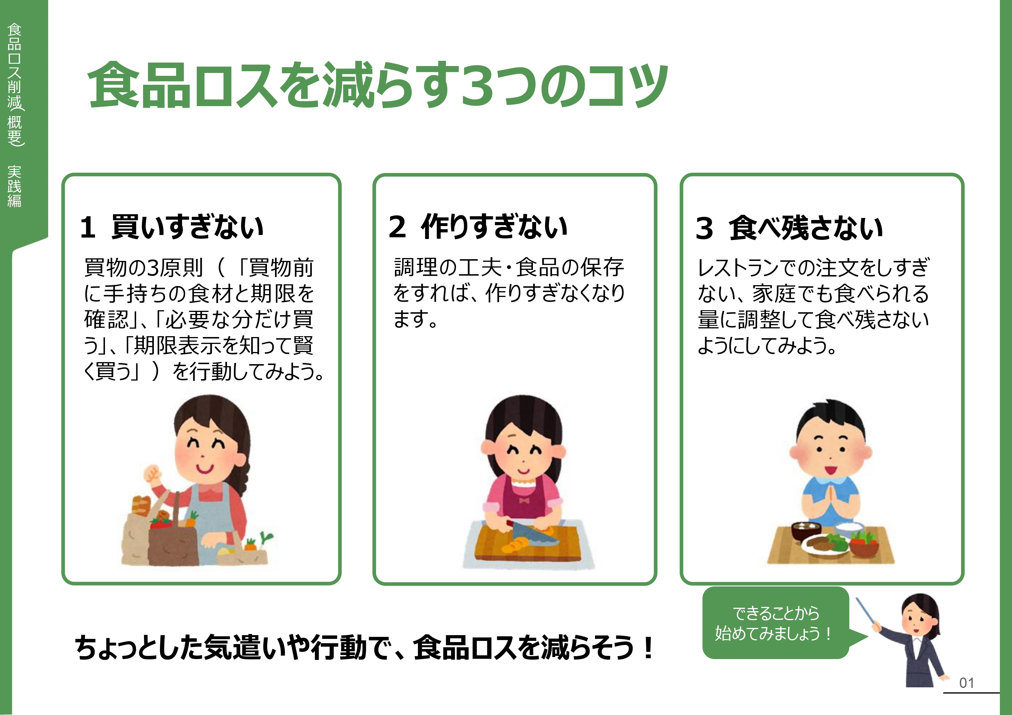 消費者庁が作成した食品ロス削減ガイドブック(令和6年度版)等にも、消費者としてできることが掲載されています。ご家庭での参考にしてみてください。