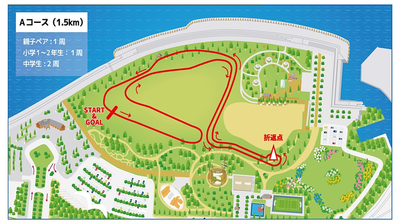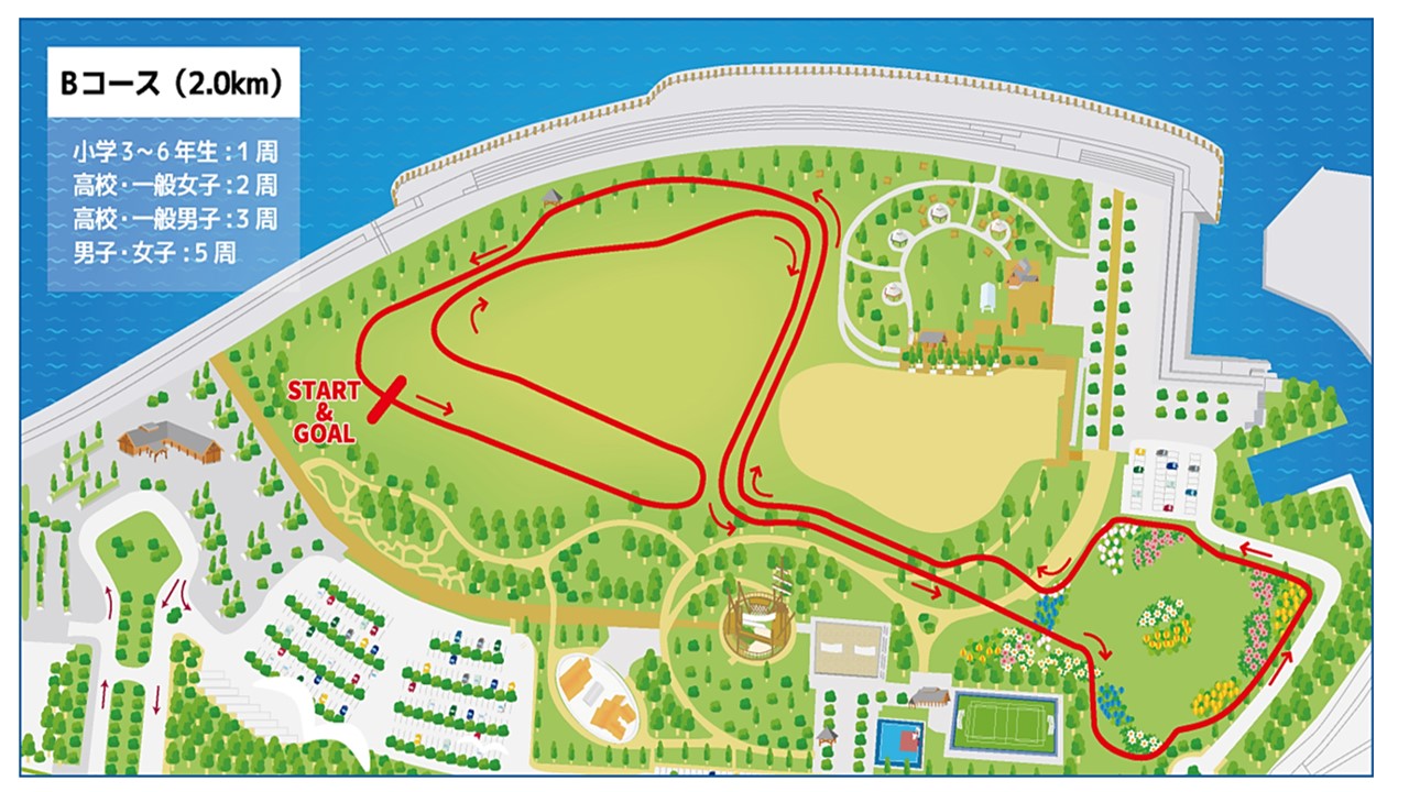 | コース図 | (1) 親子ペア、小学1年生~2年生、中学生 Aコース (2) 小学3年生~6年生、高校・一般男女、男女 Bコース |